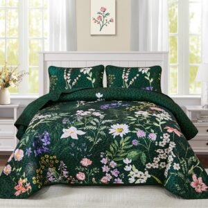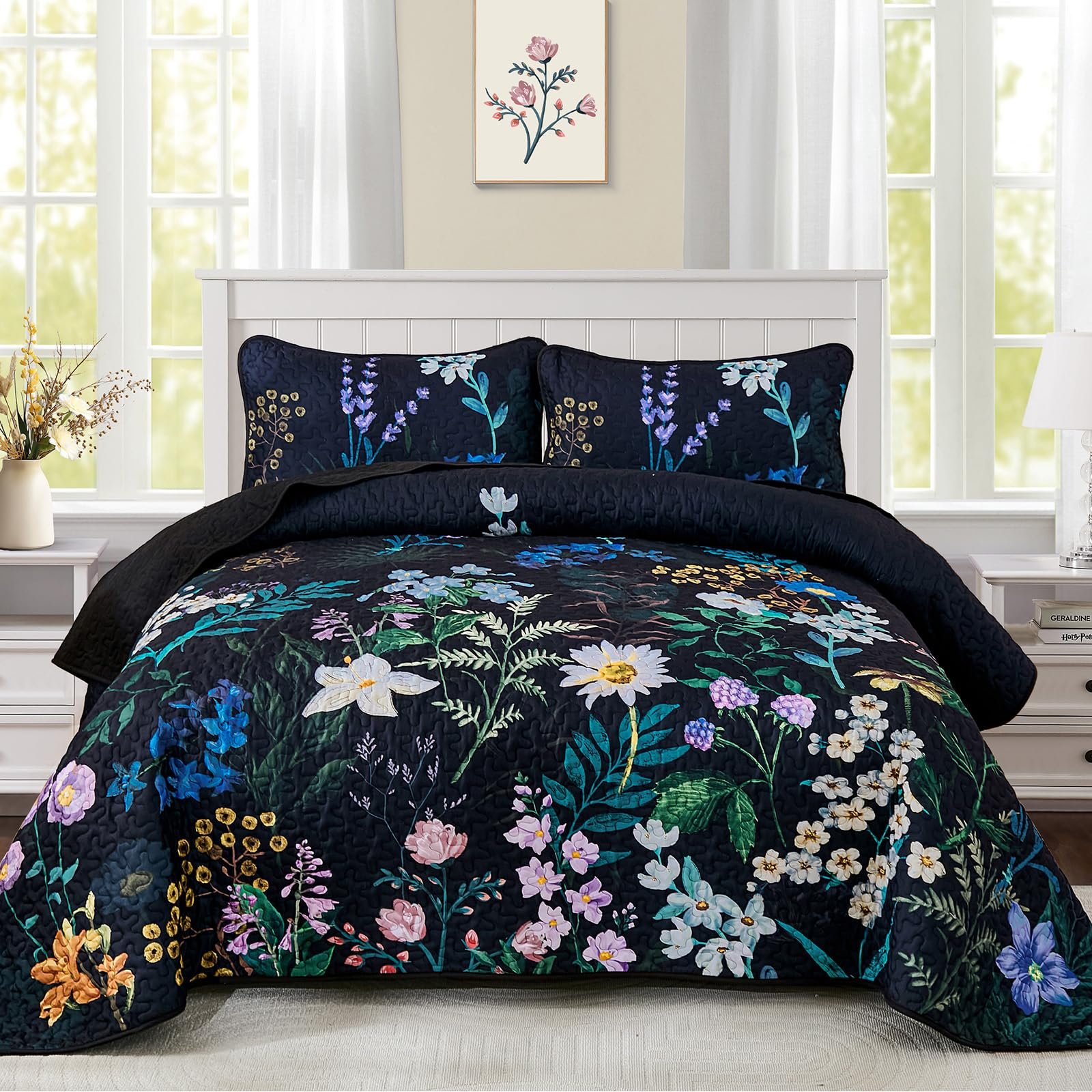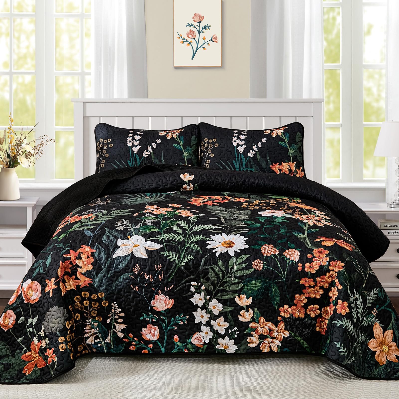 BBTHINGS Floral Quilt Set Queen Size, Black Orange Botanical Bedspreads Bedding Set